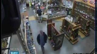 Surveillance cameras catch a man and his accomplice take two high powered rifles from the Fort Wayne Gander Mountain store.